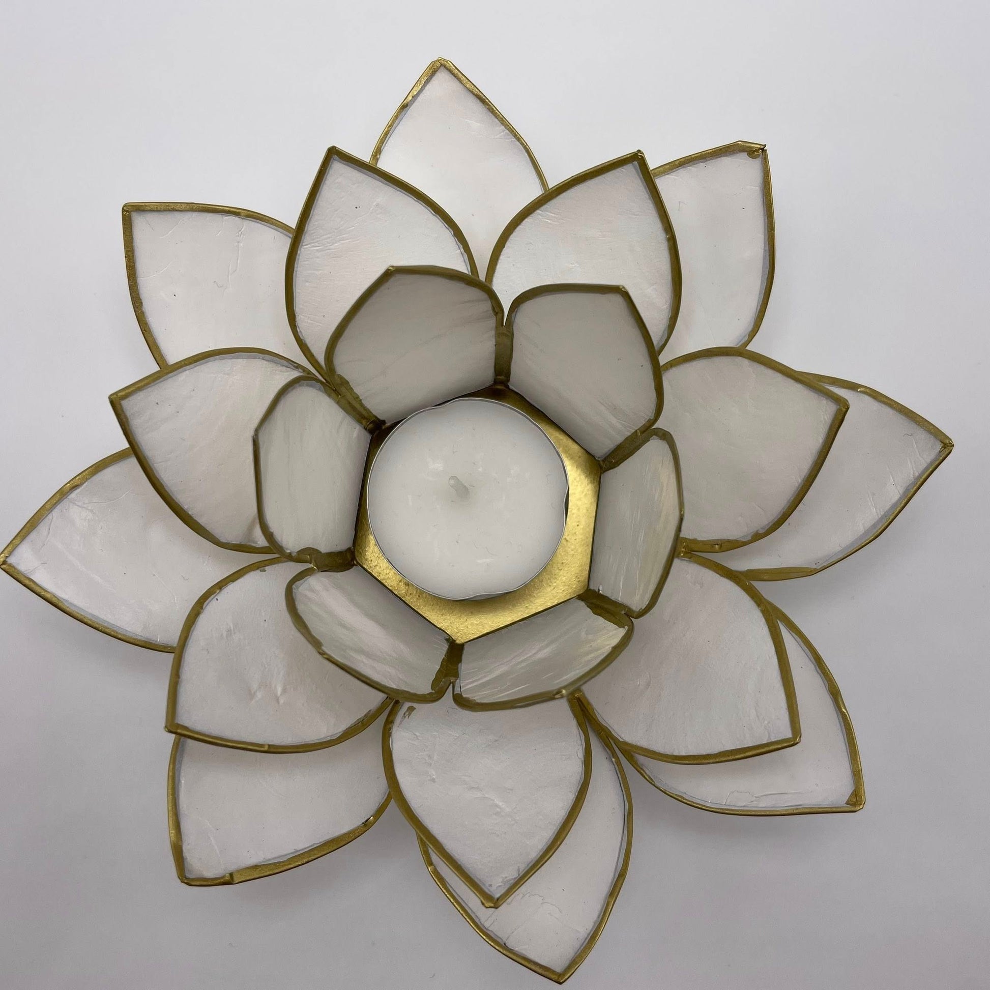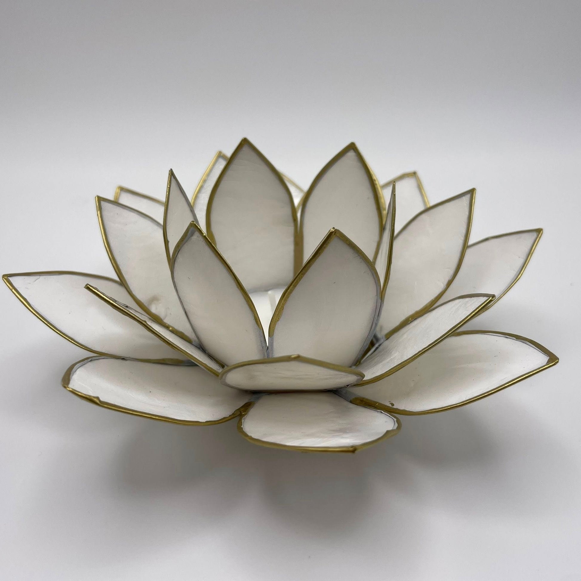 Eleganter Teelichthalter in Lotusblüten-Form aus natürlicher Capiz-Muschel. Das leicht durchscheinende Material erzeugt bei Kerzenlicht faszinierende Lichteffekte und verleiht jedem Raum eine beruhigende Atmosphäre.